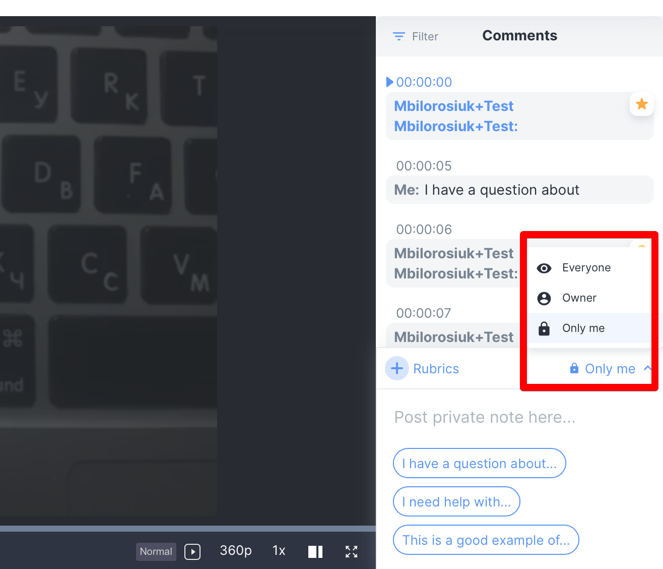 - When you’re ready to leave a comment, type anything in the comment field and select visibility option - by default comments are visible to everyone. Anytime you click in the comments field, the video will pause.
