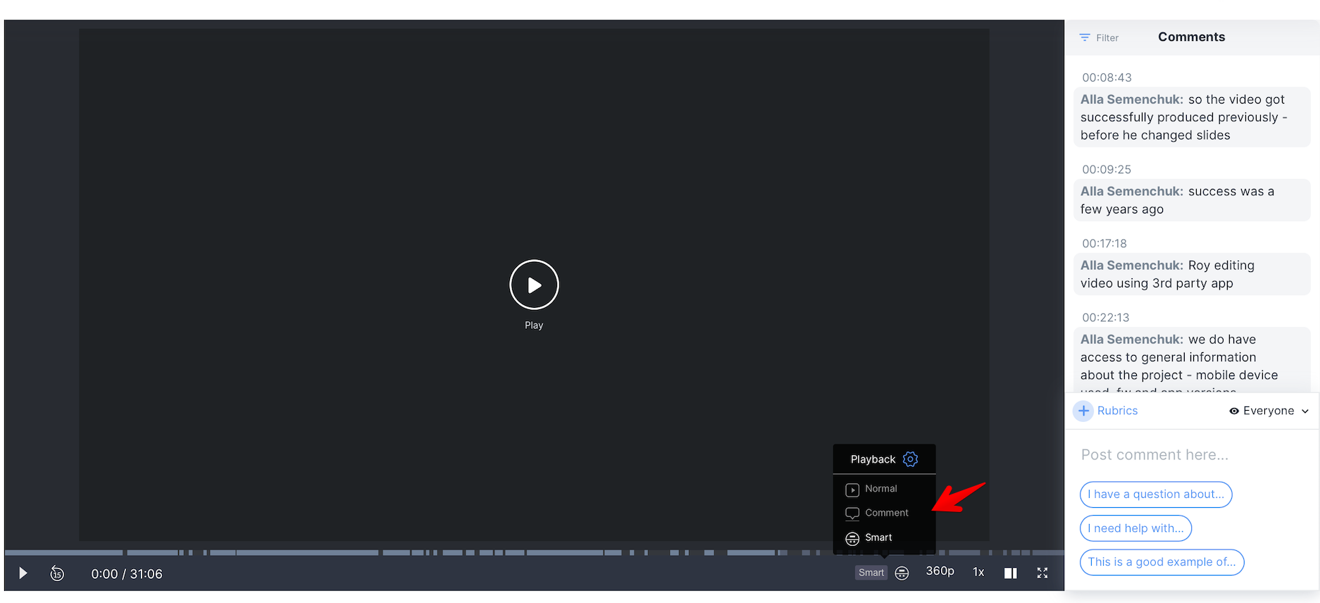 Collaboration is wonderful and often produces lots of comments. To save time, you can automatically skip to high-impact sections of the video where a comment was posted. When three or more comments are present in a video, enable Comment Playback while watching to optimize playback based on comments, including the Bookmarks! The video automatically starts playing 10 seconds before the moment when the comment was left until 10 seconds after this moment and then transitions to the next comment. -