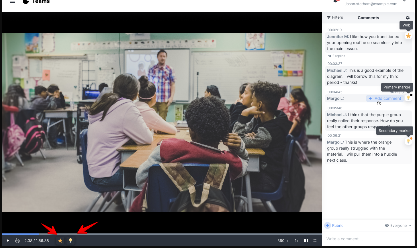 To collaborate on someone else's video while they are recording in class invite the video owner to distribute secondary markers among students and a physical observer in class, like a coach. As described above, pressing the up or down arrow on the marker leaves a time-stamped bookmark that indicates when important moments are happening in the classroom that the person who is recording themselves may not be aware of.