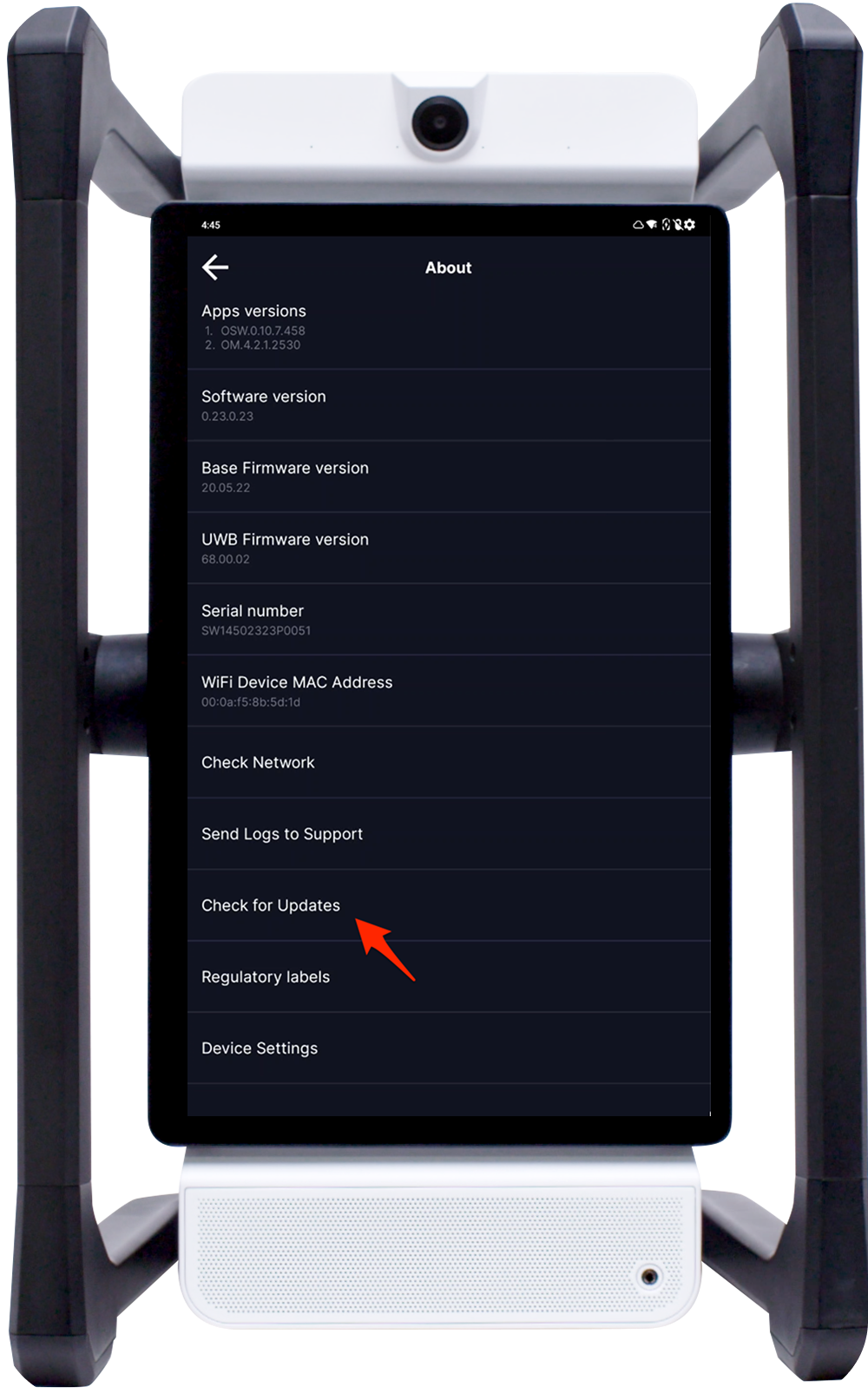 5. Check your M2 device for updates by selecting the gear icon for Quick Settings in the top right corner -> About -> Check for updates. If an update is available, select Reboot now. Updates usually take about 5 minutes.