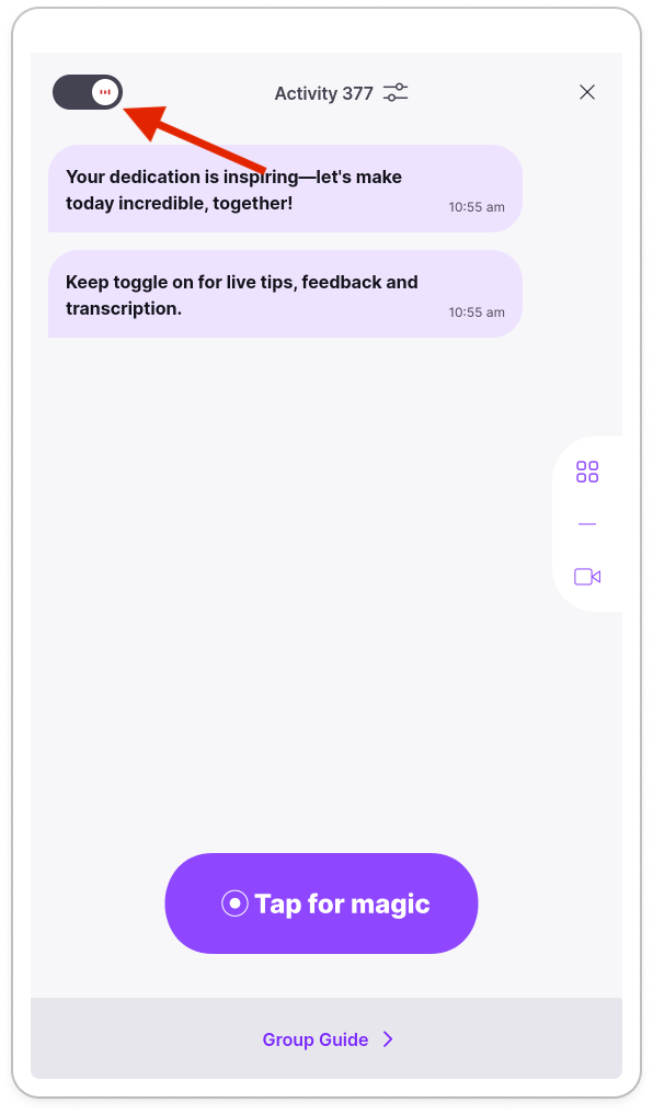 The Listening toggle (top left of the screen) allows you to control when M2 is actively listening during an activity without leaving the session. When Listening is OFF, no audio is streamed to AI and no live tips or feedback are generated. In this mode, single-click functionality in Personal M2 (such as M2 Statement or Guide mode set-up) is disabled. However, you can still use the Ask M2 feature if needed. The red dot indicator will appear only when using Ask M2 or while gathering objectives in Guide mode.