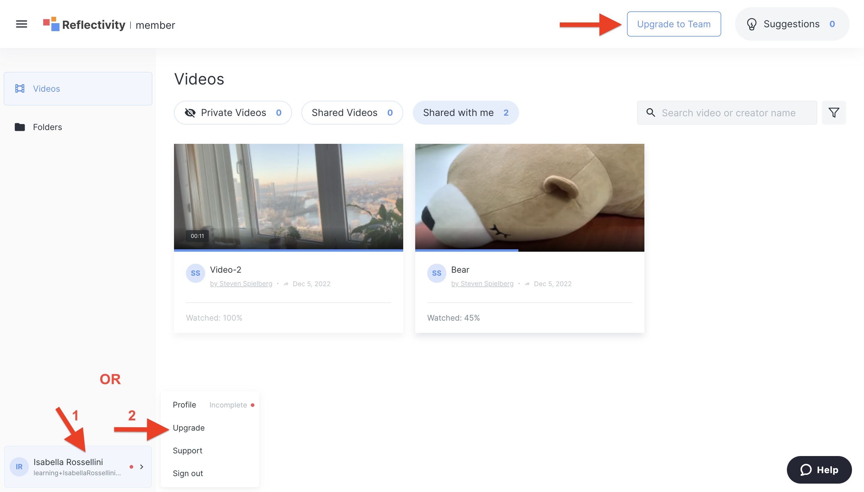 1. Click on your name at the lower left corner and select "Upgrade" from the dropdown menu