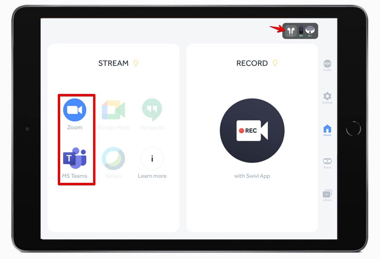 5. In the Swivl Capture app home screen, tap the Zoom or MS Teams in the Stream section. Only Zoom and MS Teams will work in the Traditional Audio Setup. Swivl will remember what you selected the last time and default to that option the next time you open the app.