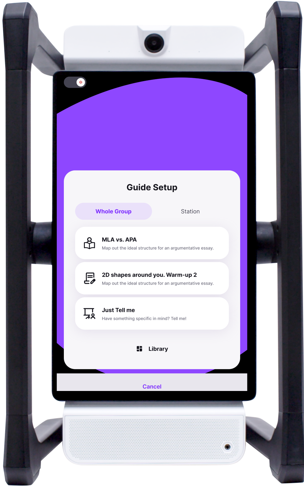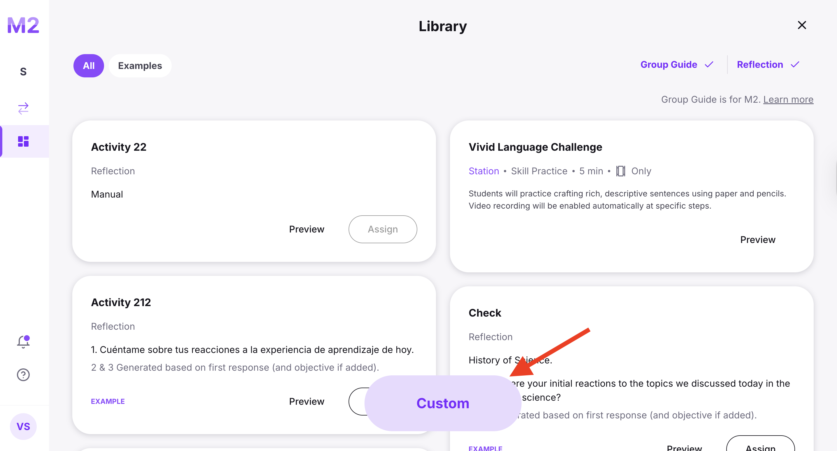 Once a Group Guide activity is saved to your Library, you can launch it in class on your M2 once you have started an M2 Session (learn more here: 📖 M2 Session: Start Your AI Co-Teacher Flow and Get Personalized Feedback).
