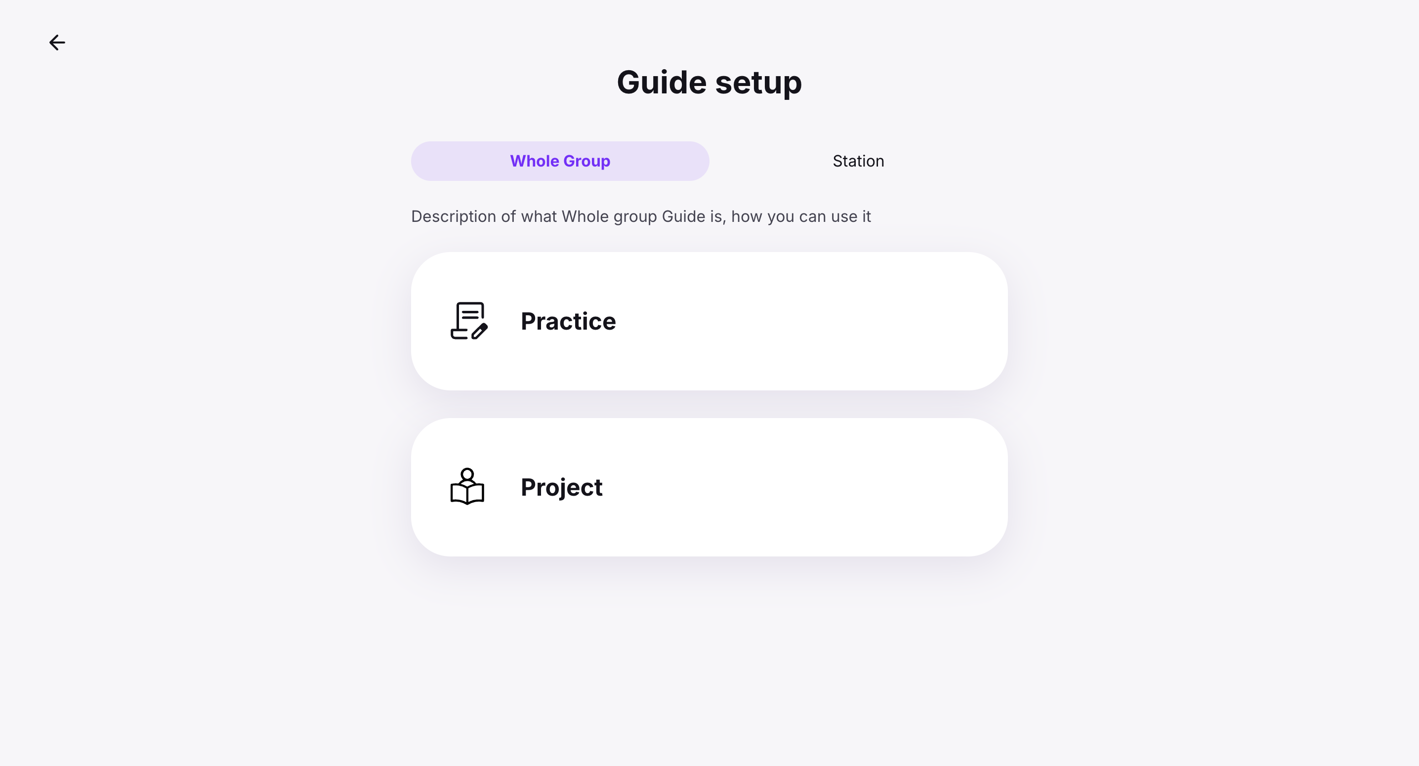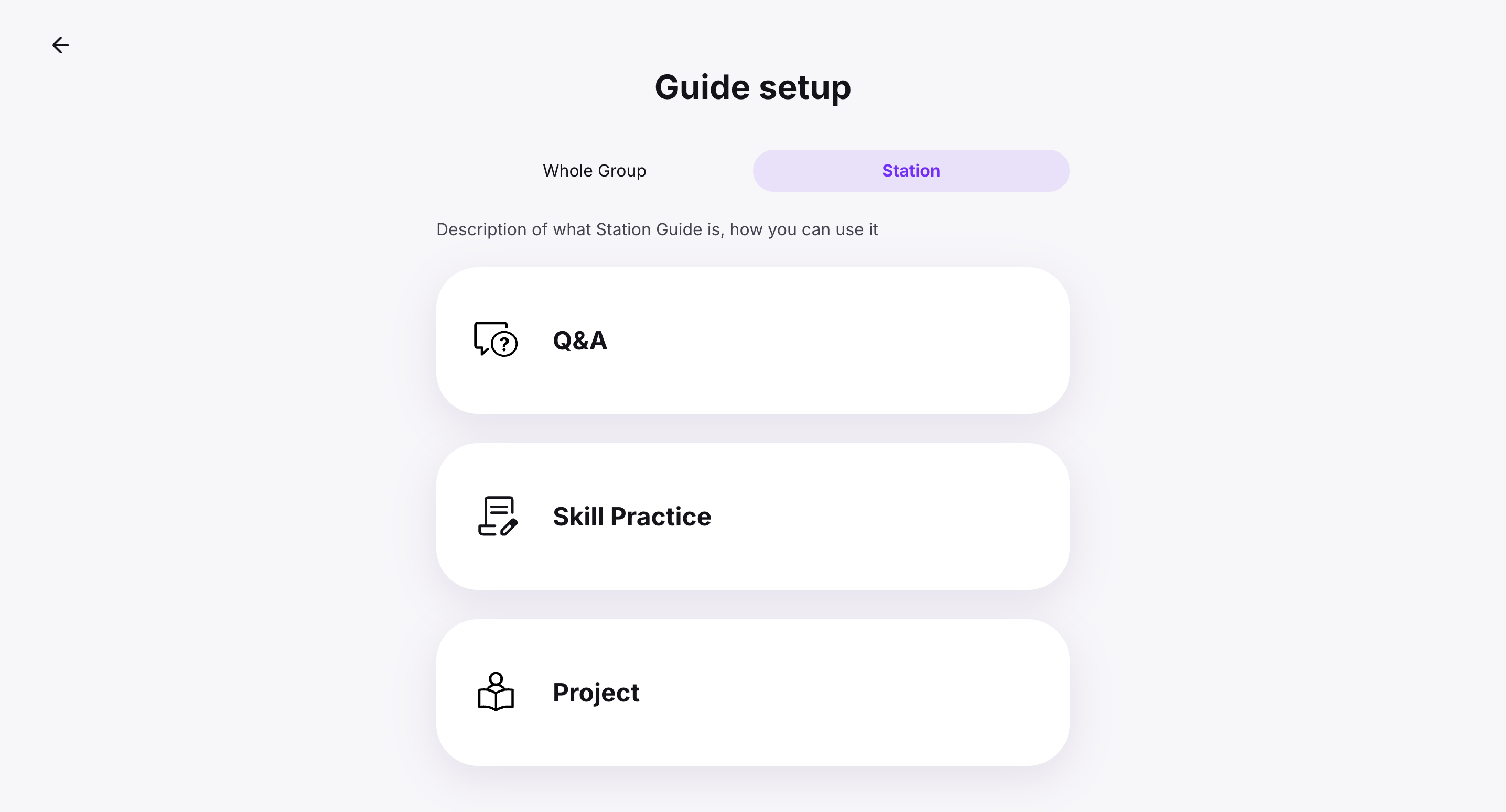 - Station: Station Guides let you assign an activity to specific students rather than the entire class. You can individually select which participants to include, giving you greater flexibility for targeted instruction, intervention, or differentiated support. The Station guides offers such activities as Q&A, Skill Practice, and Project (see descriptions for each activity below).