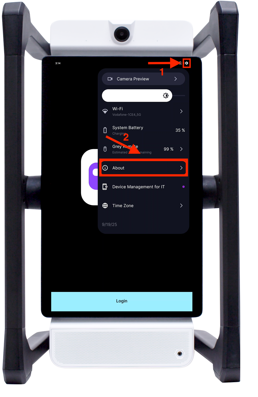 On the top-right corner of the M2 screen, tap the Gear icon and select About.